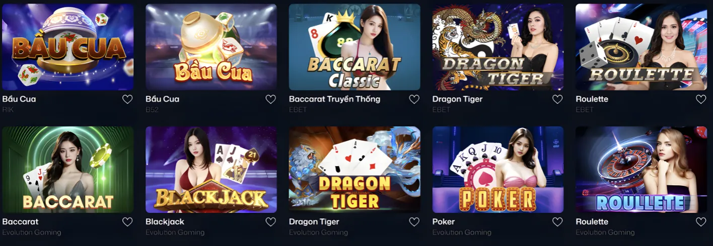 | Casino trực tuyến (Live Casino) | • Baccarat• Blackjack• Roulette• Sicbo (Tài Xỉu)• Dragon Tiger• Casino Hold’em | • Thưởng chào mừng Casino cho người chơi mới.• Hoàn tiền thua cược theo tuần hoặc theo bàn chơi.• Thưởng nạp lại (Reload Bonus) dành cho thành viên cũ.• Chương trình VIP / Cashback cho người chơi lớn. |